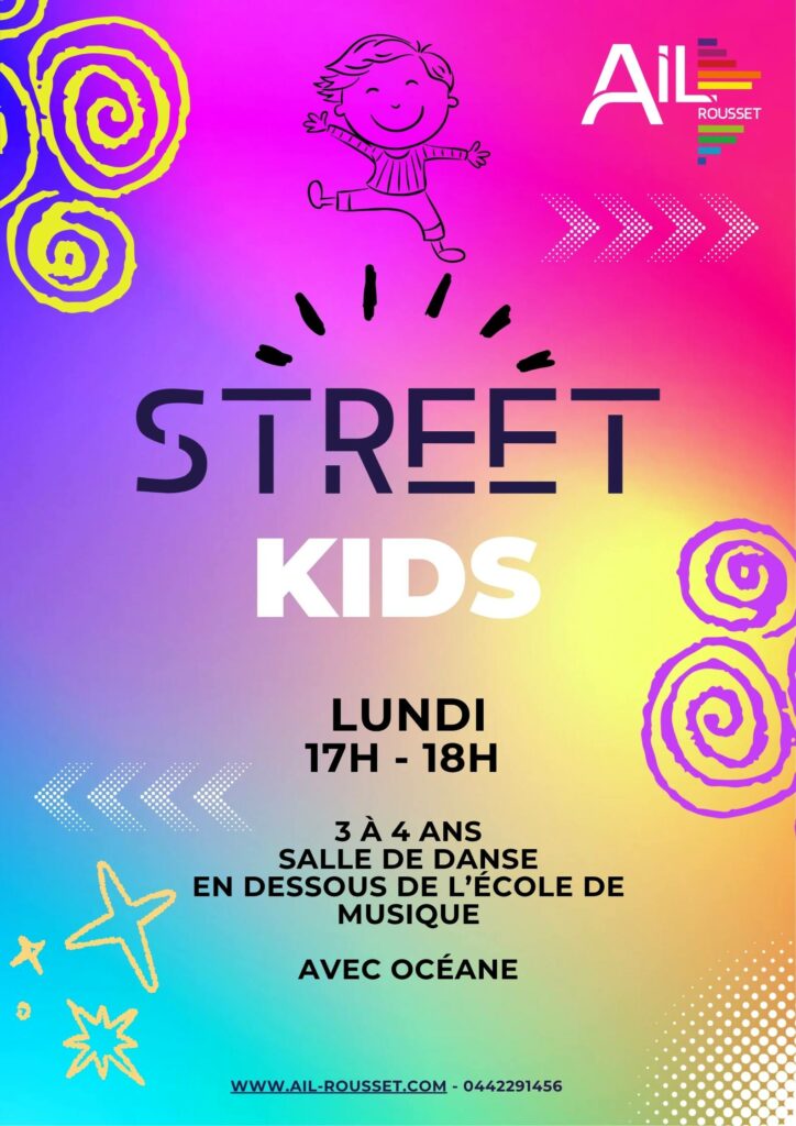 Le cours de Street Kids fera danser les tous petits sous forme de jeux. Les chorégraphies seront composées de pas simples afin de travailler le lâcher prise et l’interprétation.